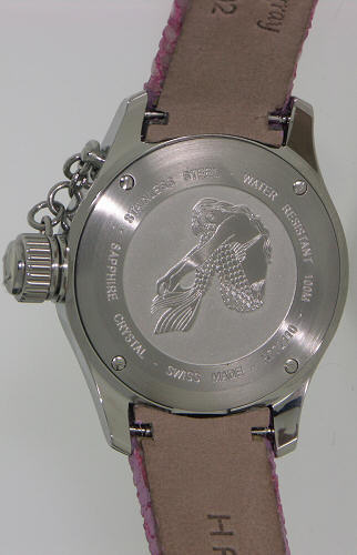 Oversized style. Sport style, screw-down (threaded). Small fish on a chain above crown.