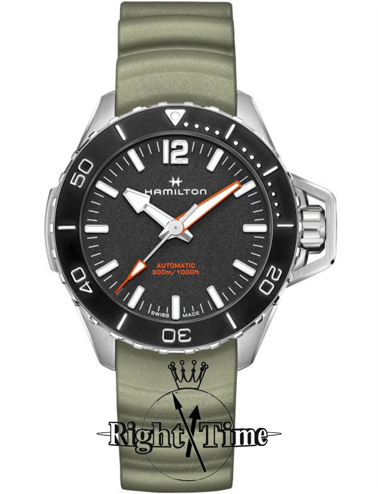 Hamilton Khaki Navy Frogman model H77825331. Hamilton H-10 Swiss made automatic movement with 80 hour power reserve. Solid stainless steel case with uni-directional bezel. Black dial with luminous hands and markers. Green color rubber strap. Sapphire crystal. Diver rated to 300 meters.