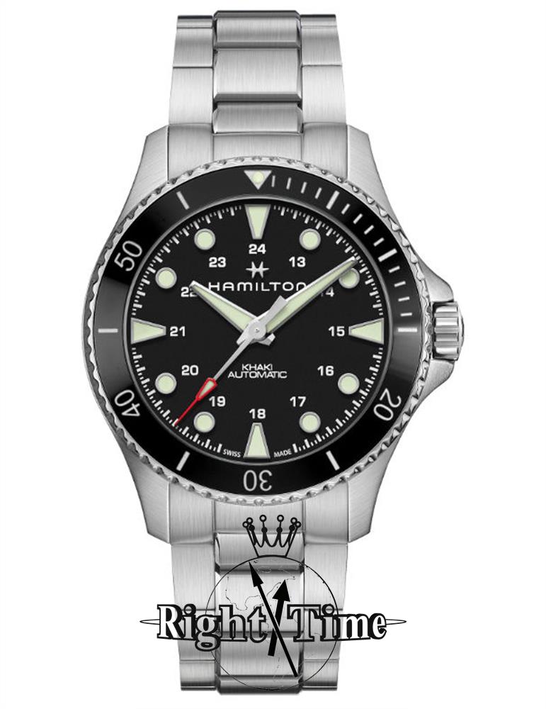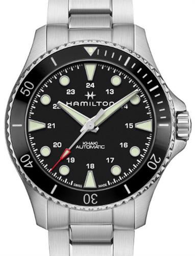 Hamilton Khaki Navy Scuba automatic watch model H82515130. Swiss made Hamilton H-10 automatic movement, with 80 hour power reserve. Satin finish stainless steel case and bracelet. Black dial with luminous hands and markers. Uni-directional bezel with black ceramic 0-60 insert. Sapphire crystal. Water resistant to 300 meters.