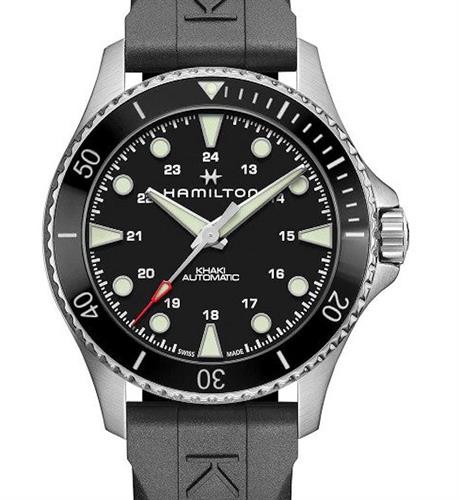 Hamilton Khaki Navy Scuba automatic watch model H82515330. Hamilton H-10 automatic movement. Satin finish stainless steel case with black rubber band. Black dial with luminous hands and markers. Uni-directional bezel with black color 0-60 insert. Sapphire crystal. Water resistant to 300 meters.