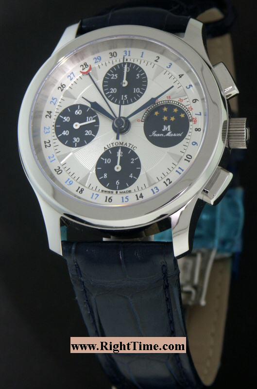 Jean Marcel watch with Swiss Automatic ETA/VALJOUX Cal. 7750 chronograph movement with 25 jewels. Functions: Moon Phase indicator window, Pointer hand Date display, 12 hr -30 min - 60 sec registered chronograph. Polished finish Solid Stainless steel knife-edge style case, sapphire crystal, observation case back and Guilloche textured silver color dial with blue sub-dials.