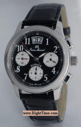 Jean Marcel Chronograph with complicated fly-back chronograph function and "Grande Guichet" Date. JACUET Cal. 8151 movement with 28 jewels and Cotes de Geneve Hand enhancements, based on Swiss ETA VALJOUX 7750 Automatic chronograph movement. Polished Stainless steel Knife-edge style case with see-through case back. Black dial with white sub-dials, "Grande Guichet" large date calendar at 12 o`clock and Arabic numerals. Black Alligator leather watch band.
