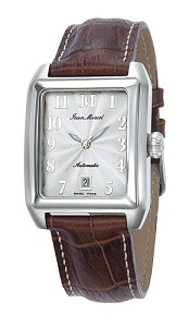 Jean Marcel automatic all Swiss made wrist watch from Jean Marcel Atlas Collection. Swiss ETA 2824 Automatic movement with date calendar on silver color Sunburst Guilloche textured dial with Arabic numerals. Rectangular stainless steel 316L case with exhibition case back and leather watch band.