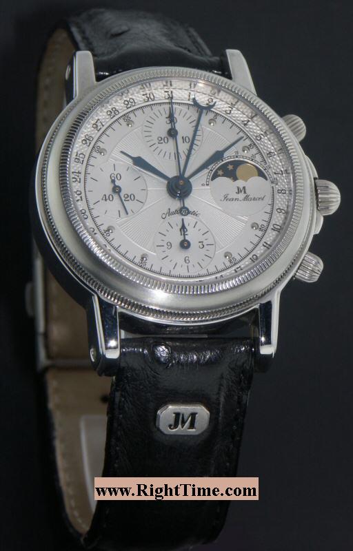 Jean Marcel watch model 160-145-52 with Swiss Automatic ETA/VALJOUX Cal. 7750 chronograph movement with 25 jewels. Functions: Moon Phase indicator window, Pointer hand Date display, 12 hr -30 min - 60 sec registered chronograph. Polished finish Solid Stainless steel case with satin finished decorated bezel, sapphire crystal, observation case back and Guilloche textured silver color dial. Leather watch band with tri-fold deployment clasp and spring release.