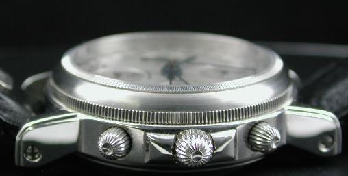 12 hr, 30 min, 60 sec registers chronograph. Moon Phase indicator window. Pointer hand Date display.