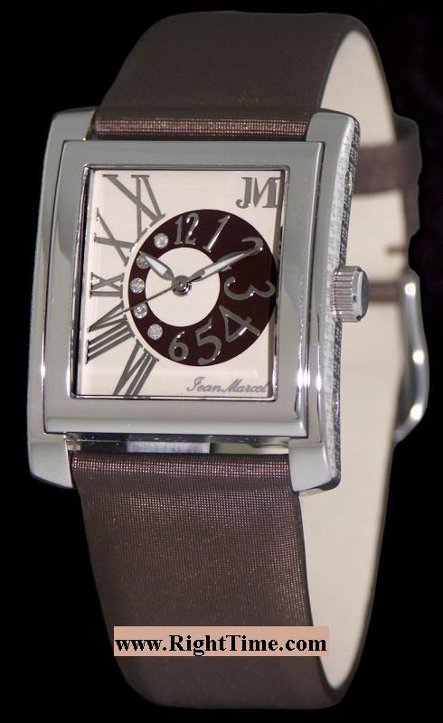 Jean Marcel Ladies wrist watch from Jean Marcel Qtank Collection. Swiss quartz movement. Cream color dial with Roman numerals and havana/tobacco color sub-dial with Arabic numerals and diamond markers. Solid stainless steel tank style case with Jean Marcel logo engraved all over case sides. Sapphire crystal. Brown color satin finished leather watch strap.