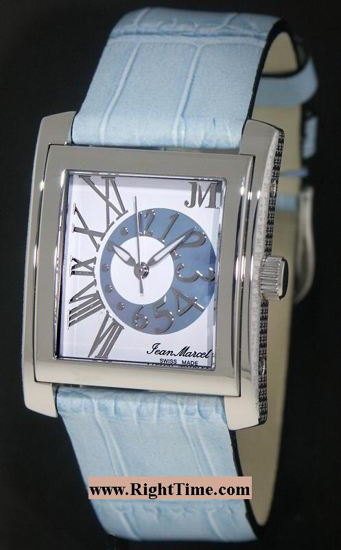 Jean Marcel Ladies wrist watch from Jean Marcel Qtank Collection. Swiss quartz movement. White dial with Roman numerals, blue genuine Mother-of-Pearl sub-dial with Arabic numerals. Solid stainless steel tank style case with Jean Marcel logo engraved all over case sides. Sapphire crystal. Blue color leather watch strap.