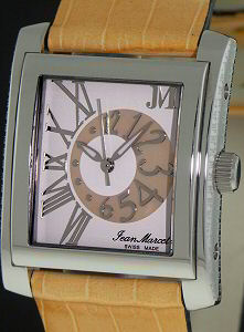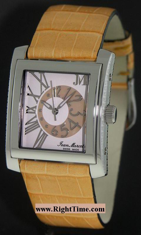 Jean Marcel Ladies wrist watch from Jean Marcel Qtank Collection. Swiss quartz movement. White dial with Roman numerals, tangerine color genuine Mother-of-Pearl sub-dial with Arabic numerals. Solid stainless steel tank style case with Jean Marcel logo engraved all over case sides. Sapphire crystal. Tangerine color color leather watch strap.