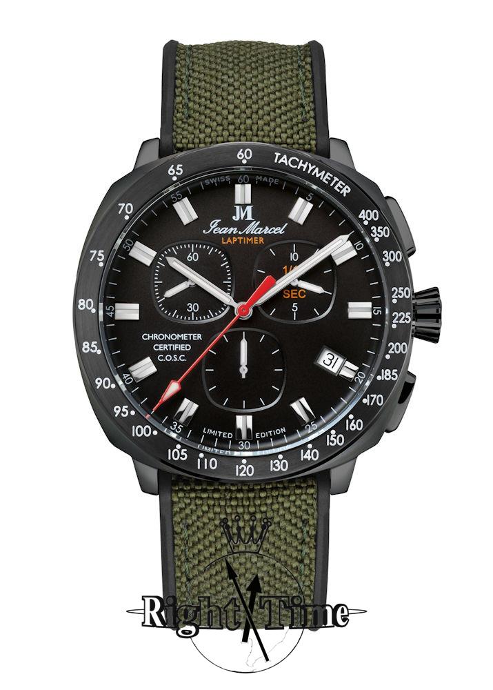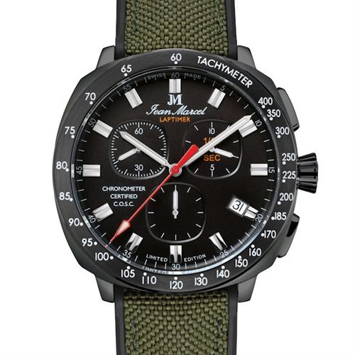 Jean Marcel quartz watch Indianapolis model 346.65.32.604. Limited Edition of 100 pieces. Certified COSC chronometer. Black stainless steel case. Black dial. Comes on a green rubber strap with cordura. Water resistant to 300 meters