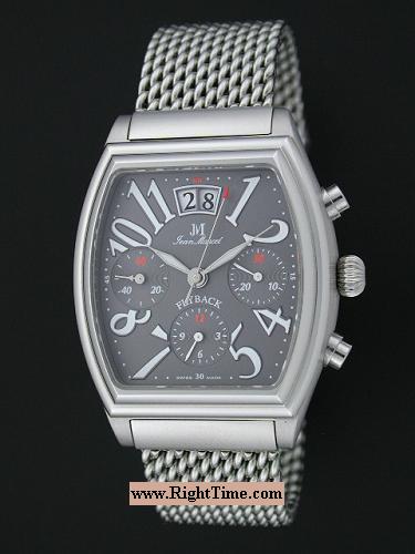 JACUET Cal. 8151 28 jewels Swiss Automatic ( Powered by wrist movement ). "Grande Guichet" large date calendar display. 12 hr, 30 min, 60 sec registers chronograph. Hand enhanced Cotes de Geneve burnished plates contrasted with fire blued screws and 28 ru