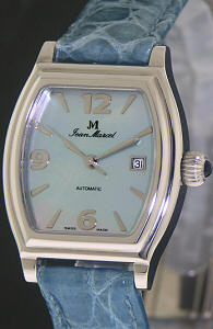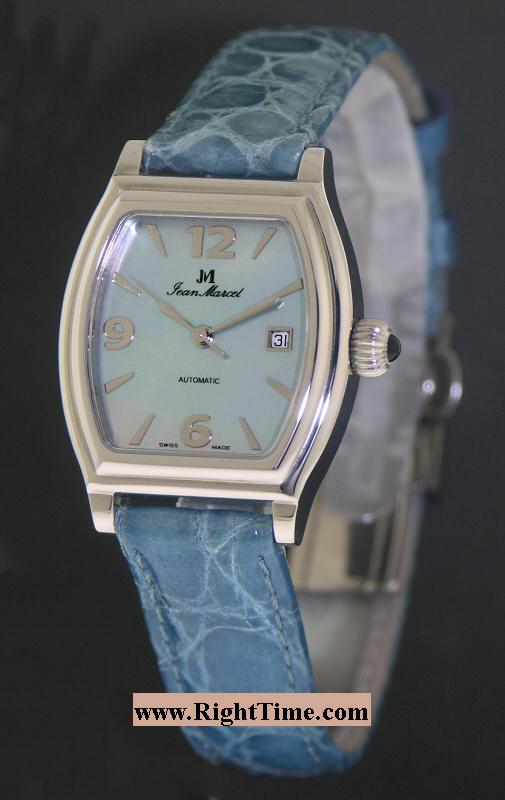 Jean Marcel Ladies wrist watch from Jean Marcel Gravis Collection. Swiss ETA Automatic movement Cal. 2824-2 with 25 jewels. Genuine Mother-of-Pearl blue dial with Date calendar. Solid Stainless steel tounneau shaped case with sapphire crystal and observation case back. Blue color Crocodile leather watch strap.