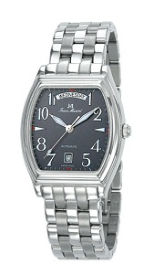 Jean Marcel automatic all Swiss made wrist watch from Jean Marcel Atlas Collection. Swiss ETA 2834 Automatic movement with day/date calendar on grey color dial with large Arabic numerals. Tounneau style polished stainless steel 316L case with polished and satin finished stainless steel watch bracelet and exhibition case back.
