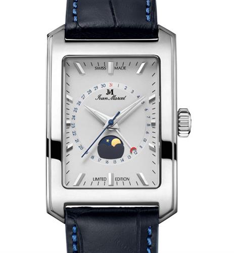 Jean Marcel Automatik watch Quadrum III Model 370.60.52.103. Limited Edition of 100 pieces. Stainless steel tank style case. Silver color dial with moon phase calendar and date pointer hand. Comes on a blue leather strap. Water resistant to 100 meters