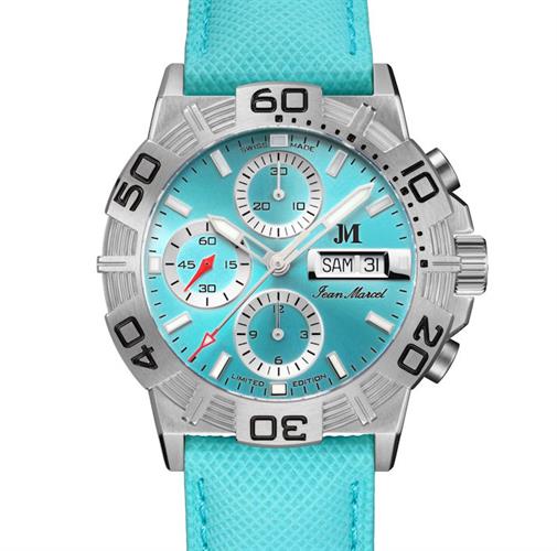 Jean Marcel Automatic Chronograph Mythos II Model 520.60.82.76. Limited Edition of 100 pieces. Stainless steel case. Turquoise blue dial with day/date calendar. High-tech dynamic turquoise blue strap. Water resistant to 300 meters