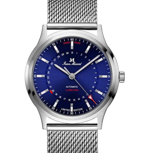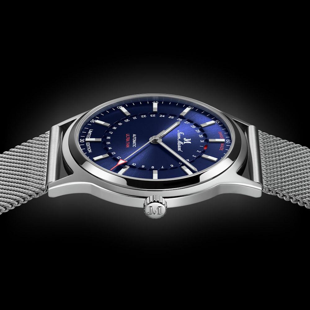 Jean Marcel Automatik watch Stealth Model 540.60.62.86. Limited Edition of 100 pieces. Stainless steel case. Blue dial with date pointer hand. Stainless steel mesh bracelet. Water resistant to 50 meters