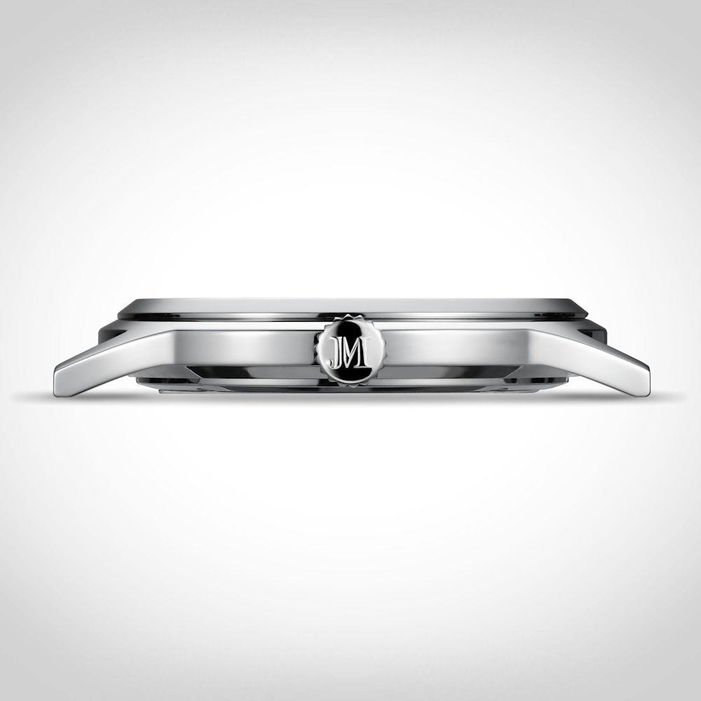 Applied polished steel tone markers. Turquoise blue color. Mystery Effect – invisible JM emblem on the crystal becomes visible when breathed on.