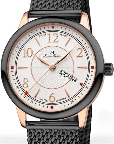 Jean Marcel Palmarium watch model 564.271.53. Limited Edition of 300 pieces. Powered by ETA based 2836-2 automatic movement. Stainless steel rose gold plated case with black plated bezel. White dial with day/date calendar. Non-reflective sapphire crystal, with JM logo which becomes visible when breathed on. Black plated mesh steel bracelet. Water resistant to 100 meters