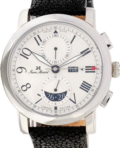Jean Marcel Clarus Vertichron watch model 960.250.53. Limited Edition of 300 pieces. Powered by ETA based Valjoux 7750 automatic chronograph movement. Stainless steel case with observation back. White dial with day/date calendar. Non-reflective sapphire crystal. Black genuine Stingray strap. Water resistant to 100 meters