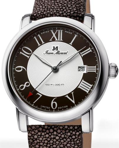 Jean Marcel Clarus watch model 960.251.76. Limited Edition of 300 pieces. Powered by ETA based 2824-2 automatic movement. Stainless steel case with observation back. Brown and silver textured dial with date calendar. Non-reflective sapphire crystal. Brown genuine Stingray strap. Water resistant to 100 meters