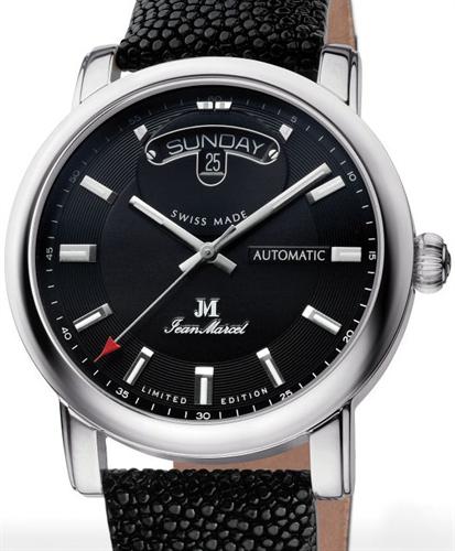 Jean Marcel Clarus watch model 960.252.32. Limited Edition of 300 pieces. Powered by ETA based 2834-2 automatic movement. Stainless steel case with observation back. Black ial with day/date calendar. Non-reflective sapphire crystal. Black genuine Stingray strap. Water resistant to 100 meters