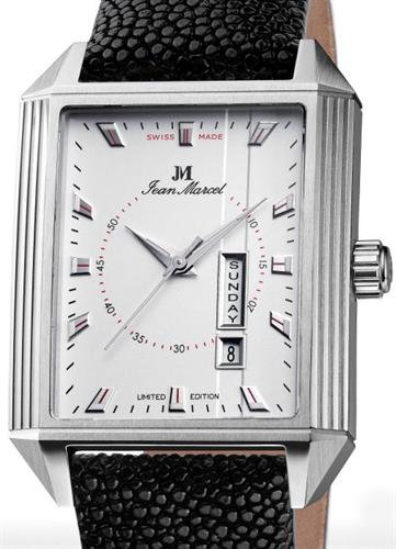 Jean Marcel QuadrumII watch model 960.265.53. Limited Edition of 300 pieces. Powered by ETA based 2836 automatic movement. Stainless steel rectangular case with observation back. White dial with vertical day/date calendar. Non-reflective sapphire crystal. Black genuine stingray leather strap. Water resistant to 50 meters