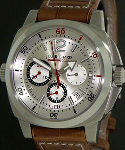 JeanRichard Chronoscope watch powered by JeanRichard JR31 movement. Stainless steel satin and polish finished case with screw-down crowns and inner-rotating 0-60 bezel. Silver color dial with date calendar and white sub-dials. Brown leather watch strap. Water resistant to 100 meters.