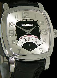 JeanRichard Seconds Retrograde watch from JeanRichard TV Screen Collection powered by JR45 movement based on ETA 2892-2 platform. Polished stainless steel case. "Clous de Paris" stamped dial (silver and black color, guilloche textured with Arabic numerals). Black alligator leather watch strap.
