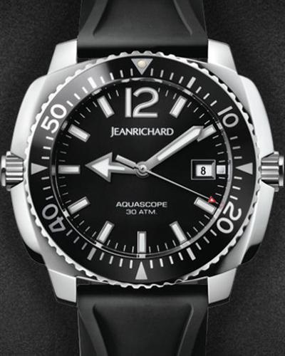 JeanRichard Aquascope watch powered by JeanRichard JR60 automatic movement. Stainless steel polished and satin finished case with screw-down crowns and black 0-60 bezel. Black color dial with date calendar and large luminous hand and markers. Black rubber watch strap. Water resistant to 300 meters.