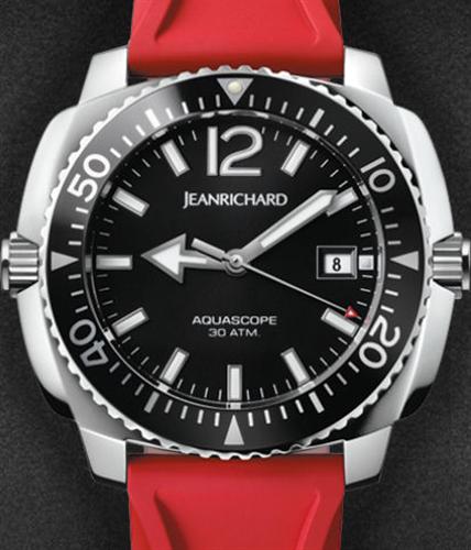 JeanRichard Aquascope watch powered by JeanRichard JR60 automatic movement. Stainless steel polished and satin finished case with screw-down crowns and black 0-60 bezel. Black color dial with date calendar and large luminous hand and markers. Red rubber watch strap. Water resistant to 300 meters.