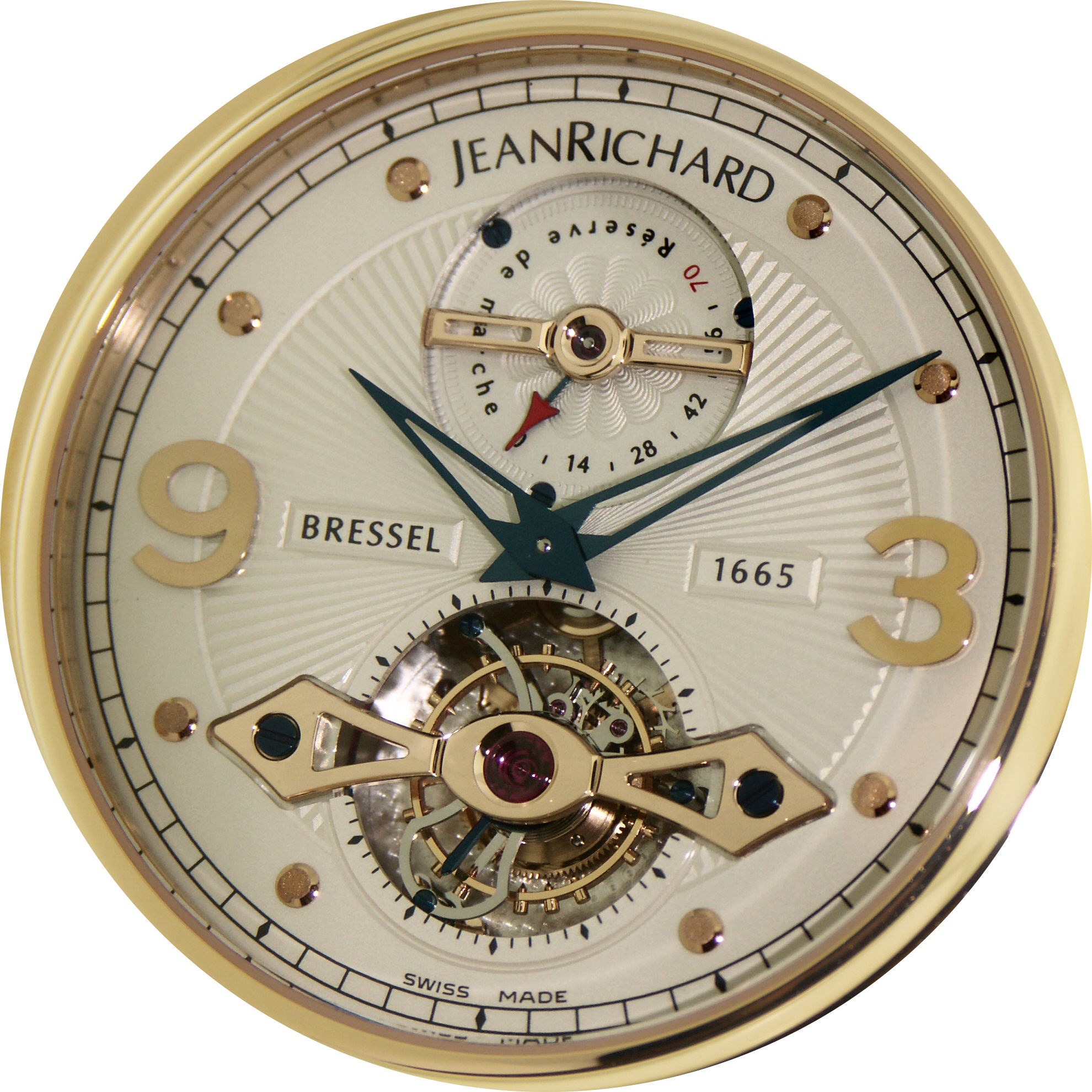 JeanRichard Bressel 1665 Tourbillon model 97112-49-10A powered by JeanRichard manufactured mechanical manual-winding Sowind 99RJ movement with 20 jewels. Gorgeous white textured dial with Tourbillon at 6 o’clock and power reserve indicator at 12 o’clock. 18k solid yellow gold case. Hand decorated case-back. Alligator watch strap with 18k gold folding buckle.
