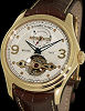 White color. Guilloche texture. Applied polished gold tone markers. Tourbillon at 6 o'clock, power reserve indicator at 12 o'clock.