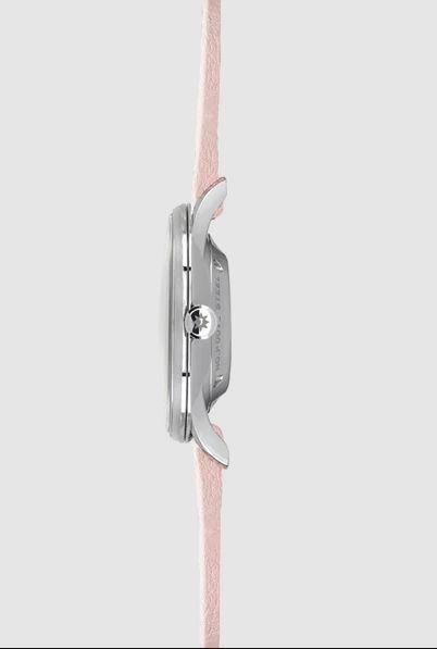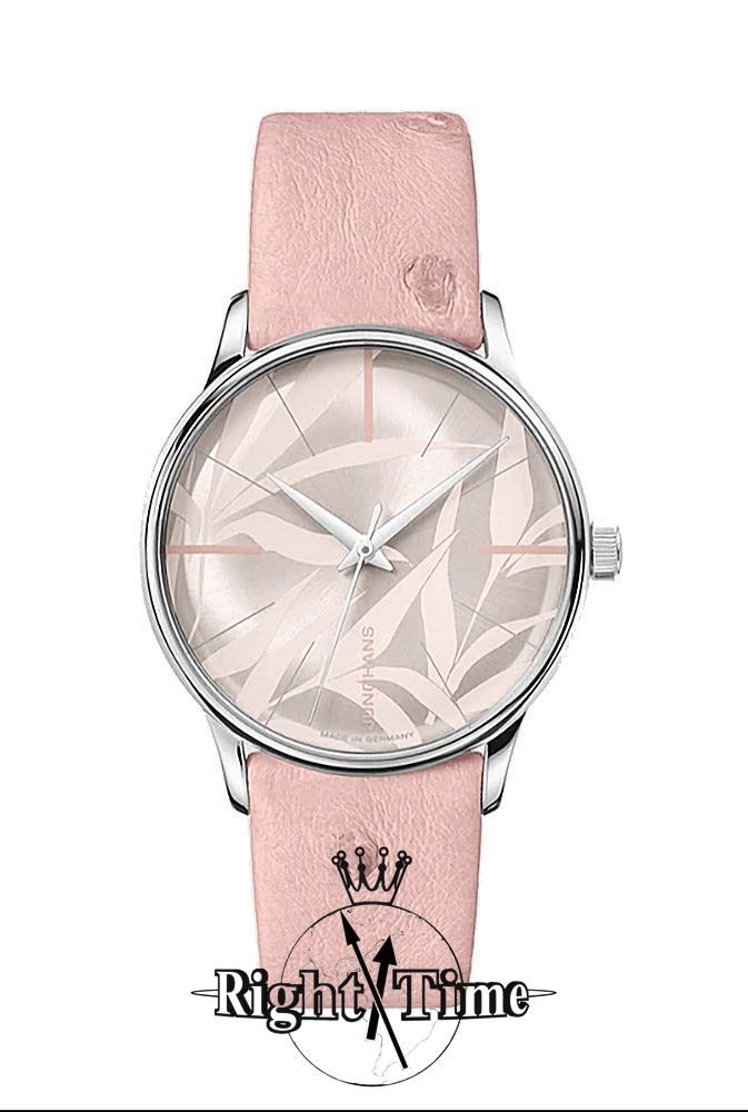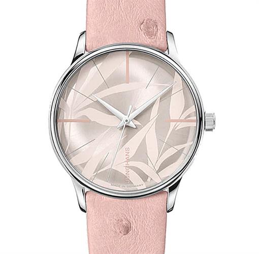 Junghans Meister Damen Automatic model 27/3242.00. Powered by automatic movement. Stainless steel case with pink ostrich leather band. Matt silver-plated sunray brush dial with printed light pink bamboo leaf. Sapphire crystal. Water resistant to 50 meters.