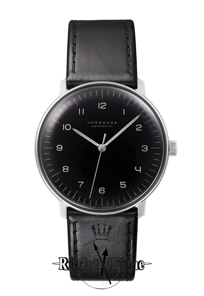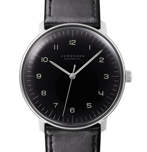 Junghans Max Bill Automatic watch model 27/3400.02. Stainless steel case with black leather band. Black dial with Arabic numerals. Sapphire crystal. Water resistant to 50 meters.
