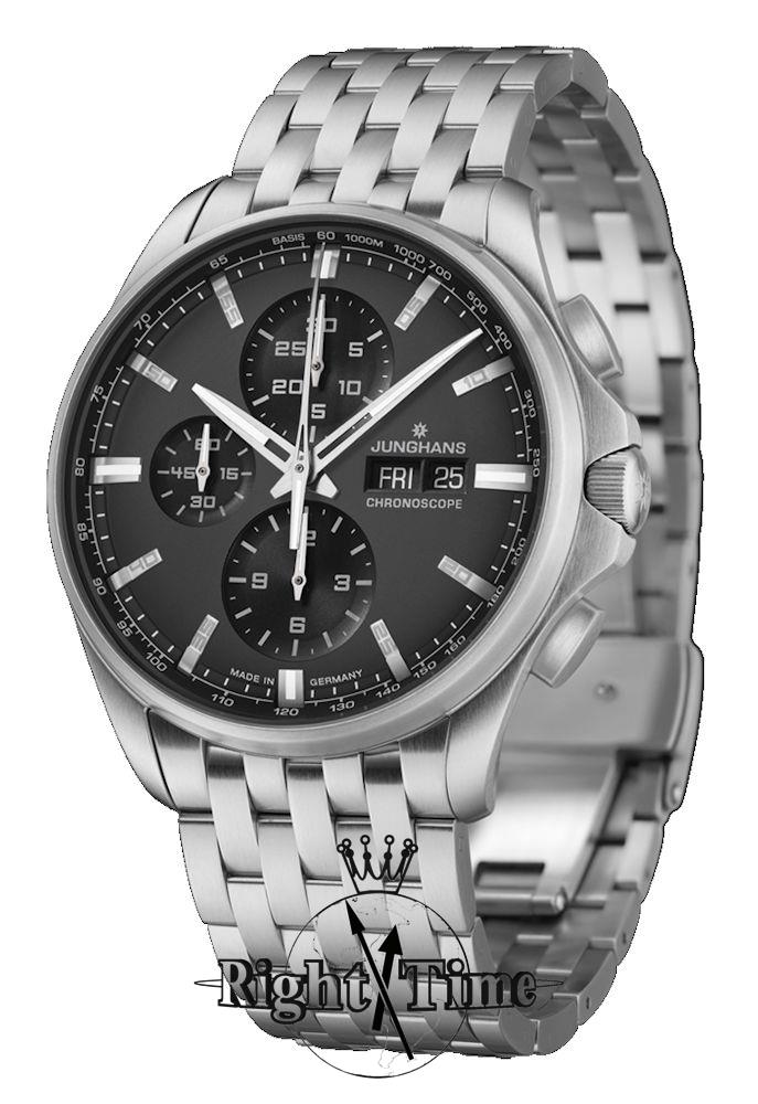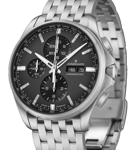 Junghans Meister S Chronoscope, English Date watch model 27/4024.45.Powered by automatic chronograph movement. Stainless steel case with bracelet. Anthracite dial with black sub-dials and day/date calendar. Sapphire crystal. Water resistant to 200 meters.