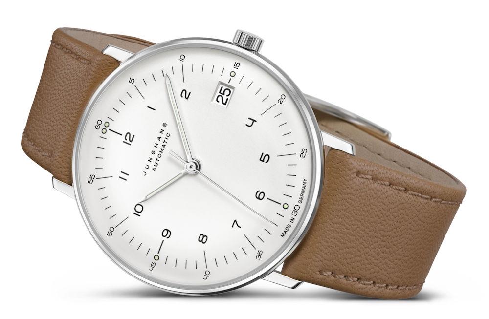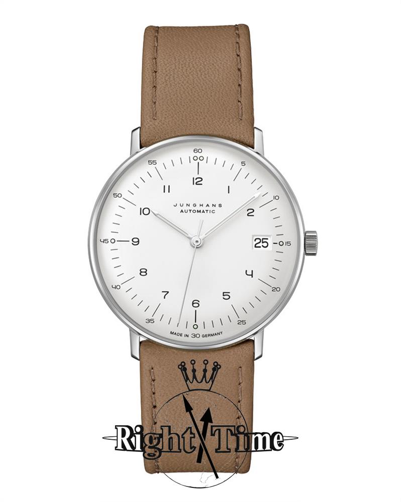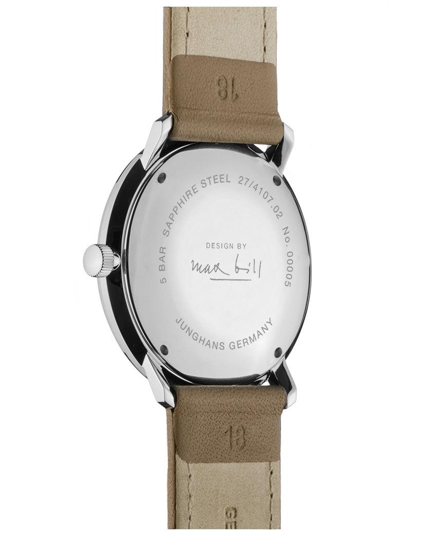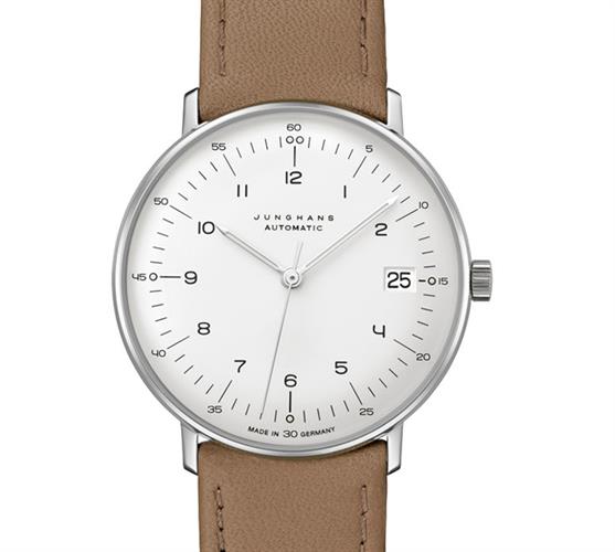Junghans Max Bill Automatic watch model 27/4107.02. Stainless steel case with tan leather band. Silver-plated dial with Arabic numerals. Sapphire crystal. Water resistant to 50 meters.