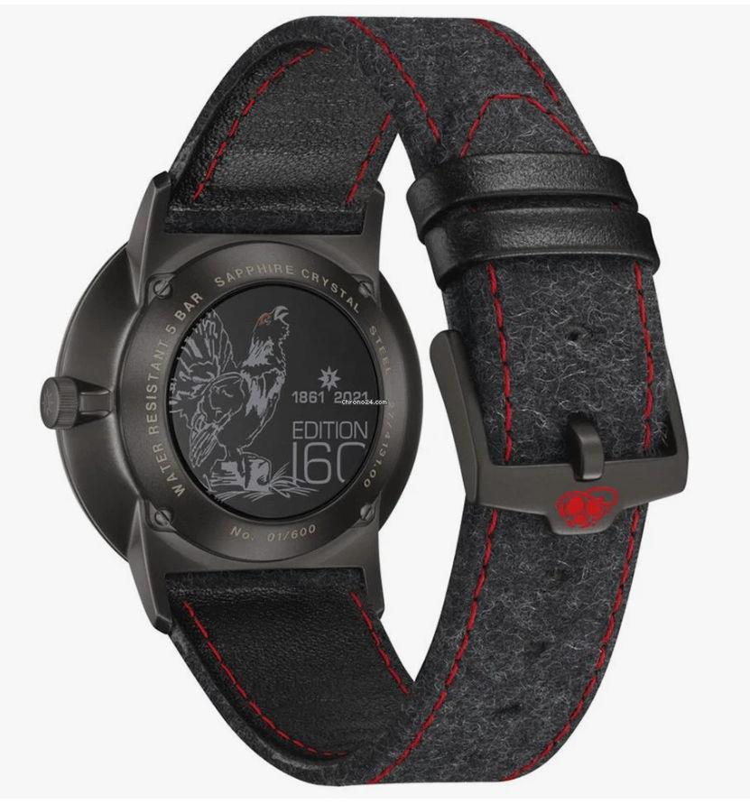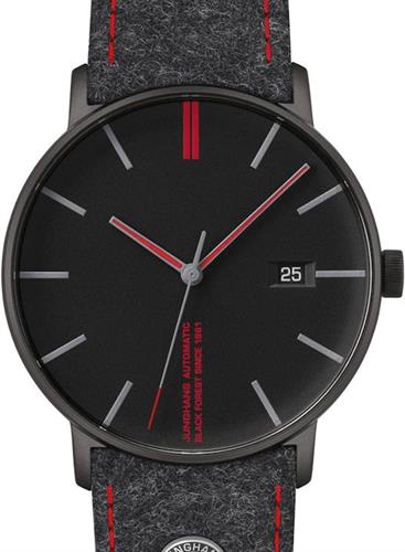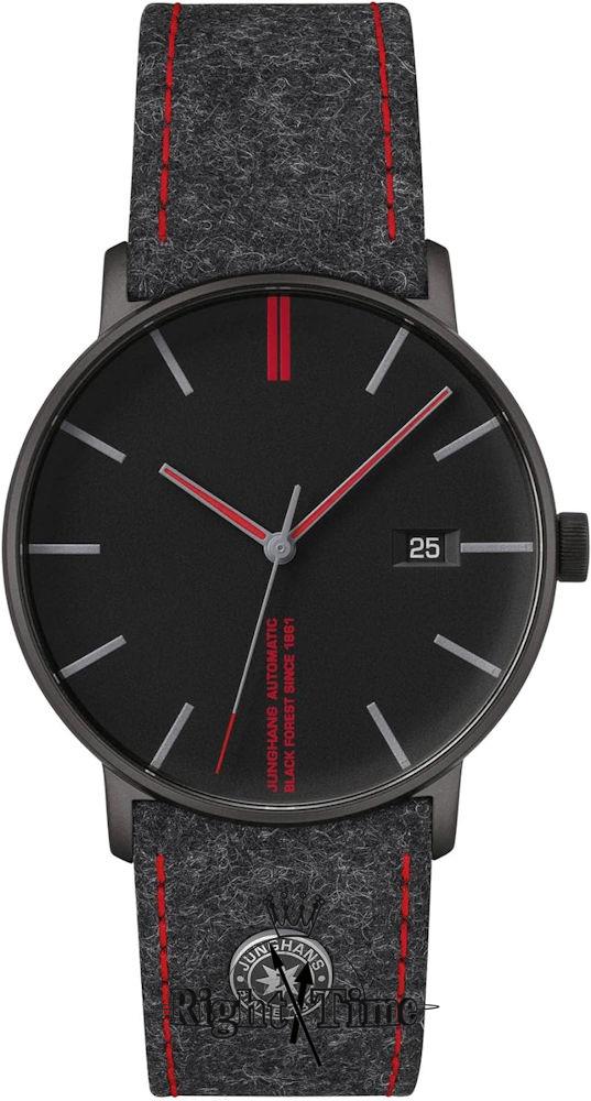 Junghans FORM ED 160 Anniversary model 27/4131.00. Limited Edition of 600 pieces. Powered by automatic movement. Black PVD plated stainless steel case with textile/leather black strap and red color accents. Black color dial with date calendar and red accents. Sapphire crystal. Water resistant to 50 meters.