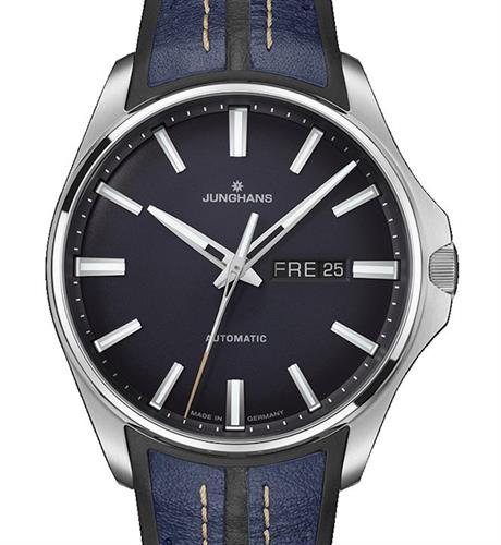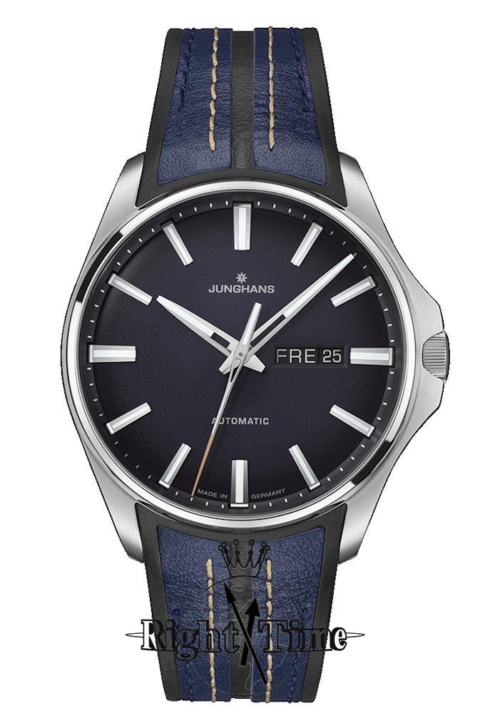 Junghans Meister S Automatic model 27/4211.00. Powered by automatic movement. Stainless steel case. Black synthetic rubber strap with blue leather inlay. Midnight blue dial. Sapphire crystal. Water resistant to 50 meters.