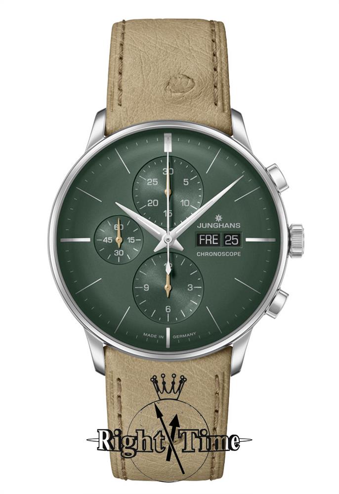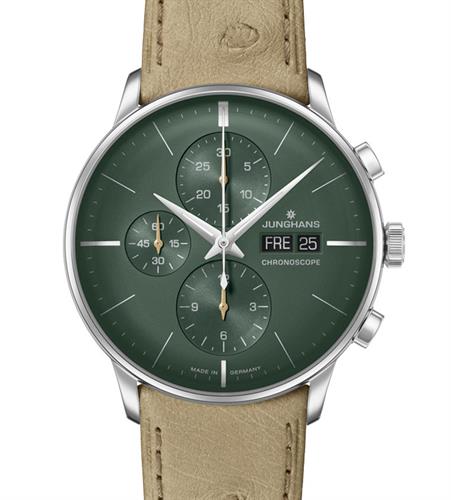 Junghans Meister Chronoscope, English Date watch model 27/4222.03.Powered by automatic chronograph movement. Stainless steel case with tan ostrich leather band. Green dial with green sub-dials and day/date calendar. Sapphire crystal. Water resistant to 50 meters.