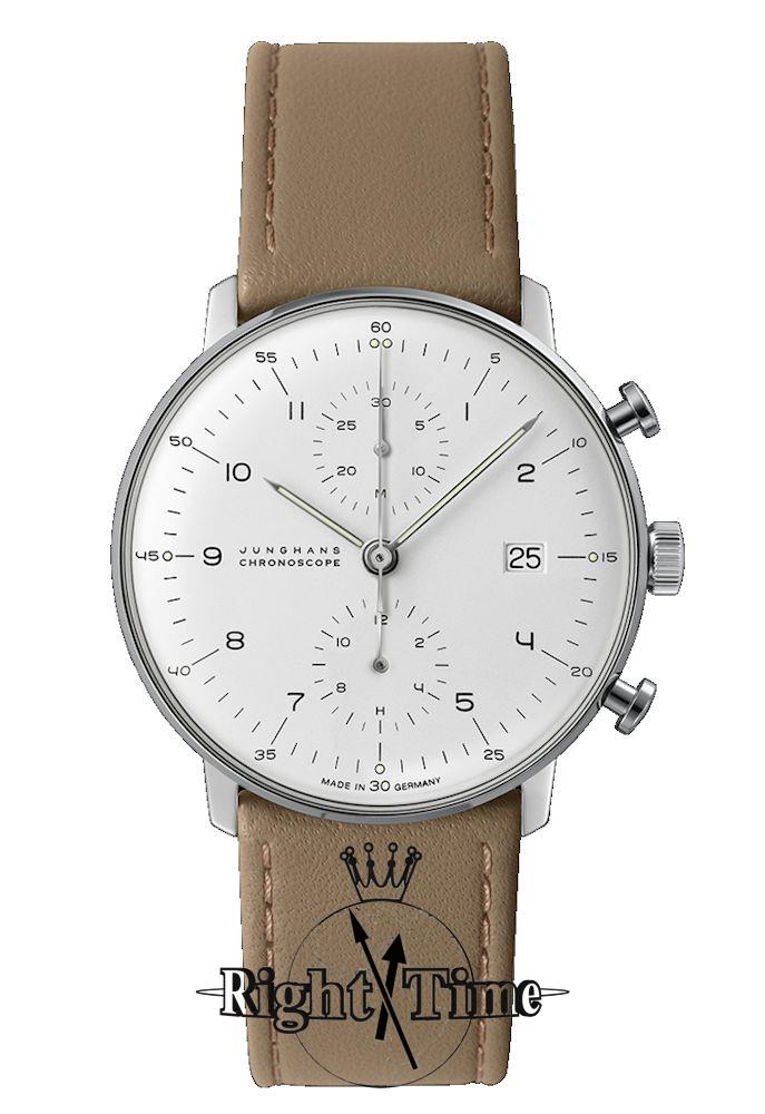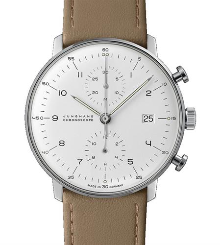 Junghans max bill Chronoscope Bauhaus watch model 27/4502.02. Powered by automatic chronograph movement. Stainless steel case with tan leather band. Silver color dial with date calendar. Sapphire crystal. Water resistant to 50 meters.
