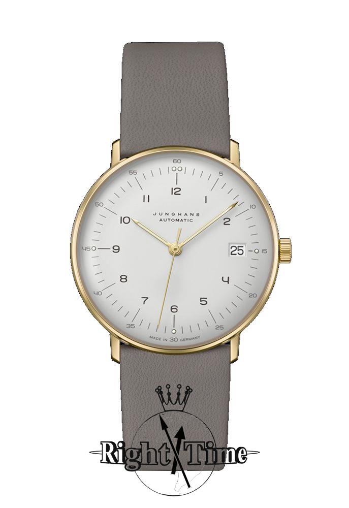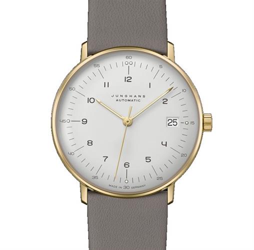 Junghans max bill Kleine Automatic watch model 27/7108.02. Powered by automatic movement. Gold PVD plated 34mm stainless steel case with grey leather band. Grey dial with date calendar. Sapphire crystal. Water resistant to 50 meters.