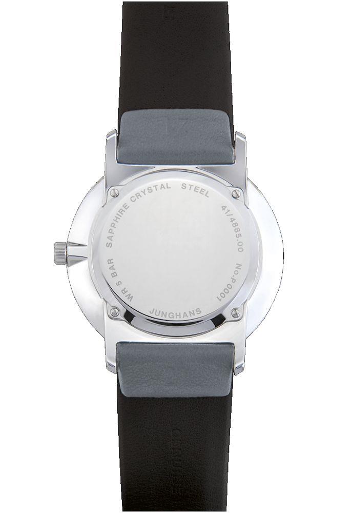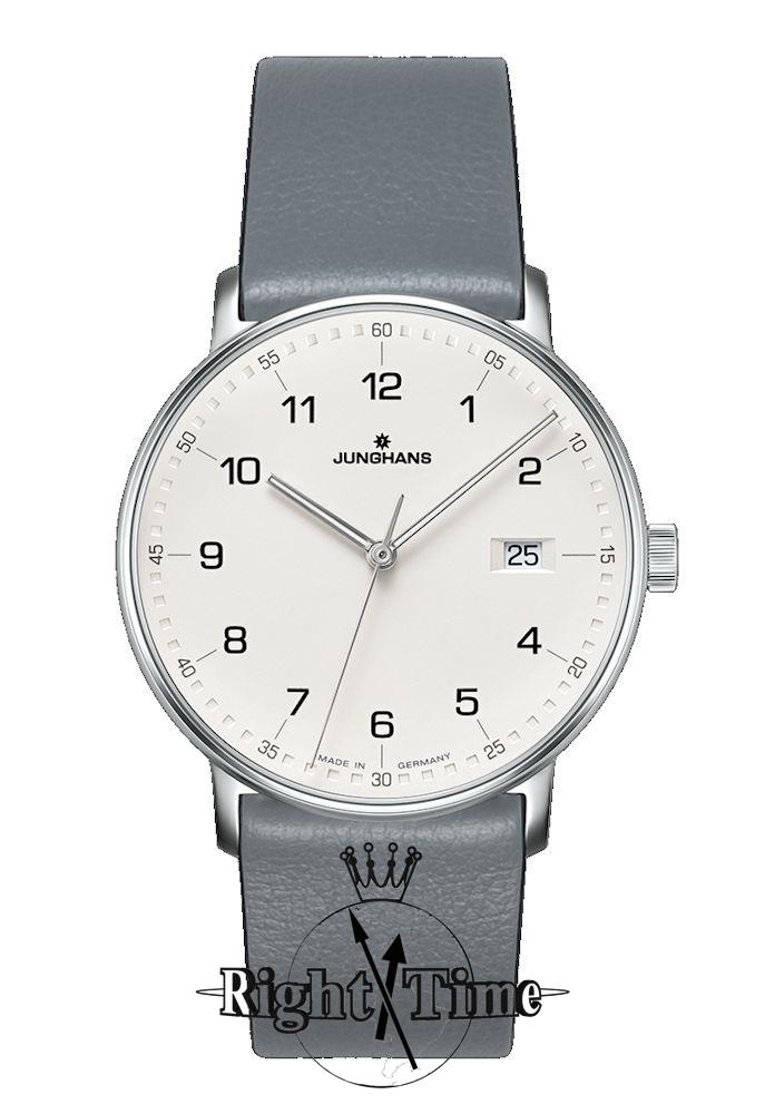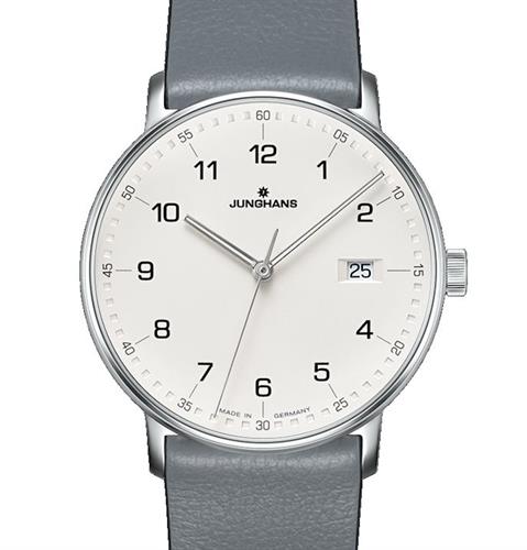 Junghans FORM model 41/4885.00. Powered by quartz movement. Stainless steel case with grey leather strap. Silver color dial with date calendar and Arabic numerals. Sapphire crystal. Water resistant to 50 meters.
