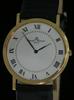 Junghans Max Bill MEGA Solar watch model 59/7324.02. Powered by radio-controlled solar movement. Yellow gold plated stainless steel case with grey band. White dial with Arabic numerals. Sapphire crystal. Water resistant to 50 meters.