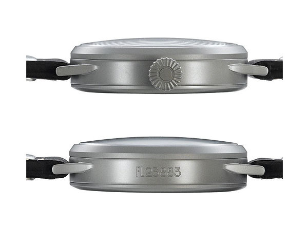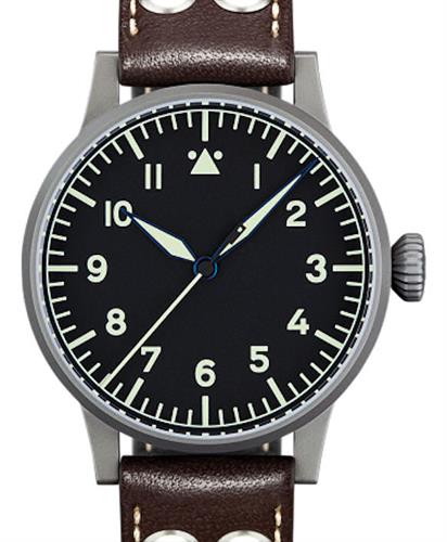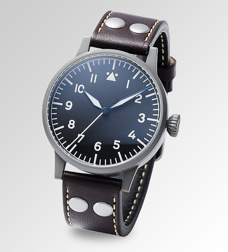 Flieger (aviation) style A dial has simple design and numbered hours and triangle at top so the pilot could see the hands at '12' at a glance in difficult visibility conditions