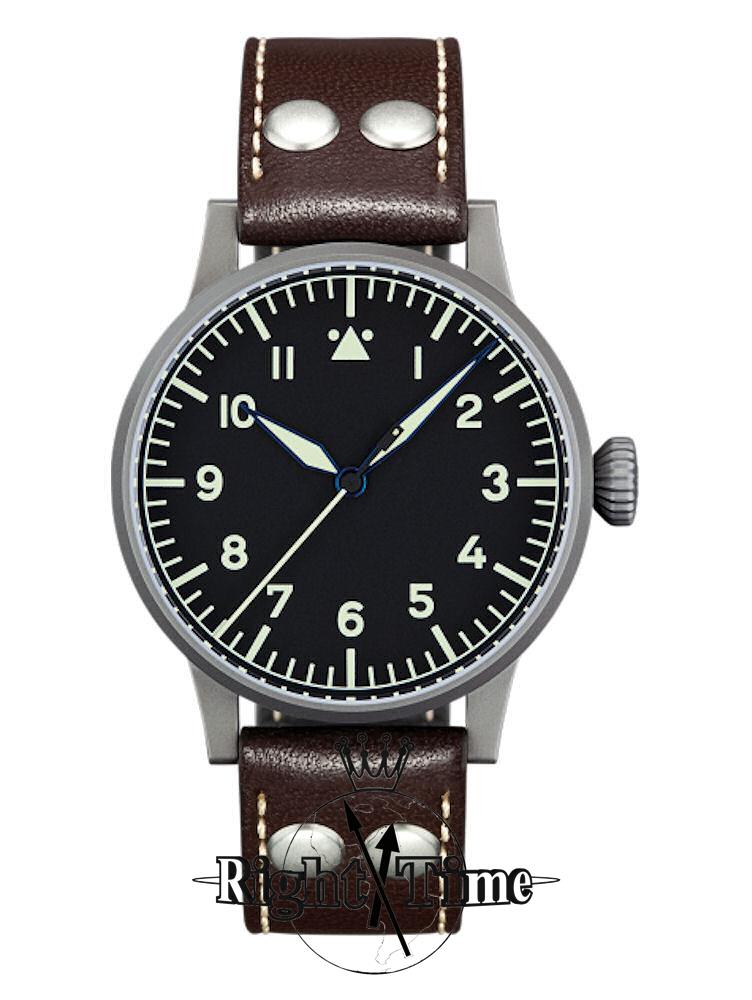 Laco Pilot watch Original SAARBRUCKEN model 861752 powered by Swiss ETA Automatic movement. Round steel case with brown leather band. Black "pilot" style dial with luminous Arabic numerals