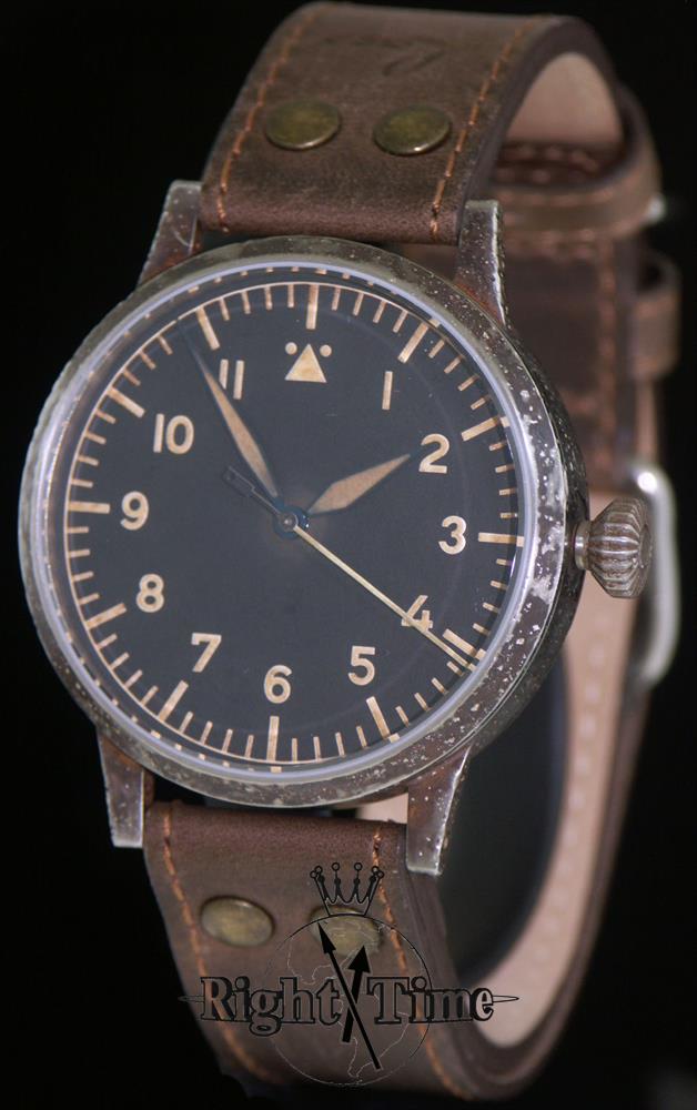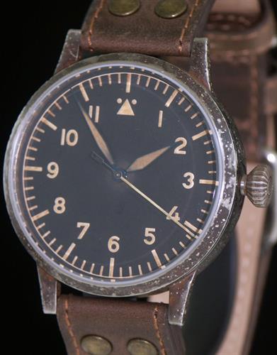 If you search the ebay for authentic world war II Luftwaffe pilot watch from Laco it will fetch around $5000-7000, today Laco employed a technique by casemakers of Pforzheim, Germany, capital of German case and band manufacturers, that make a traditional modern watch look like it was worn by a pilot and set around, maybe even buried in the ground, for over 75 years. There are 3 levels of severity of "natural damage" that Laco offers, this watch is a level 1. Heirloom pilot 45mm model 861933 "SAARBRuCKEN " with aged black "Type A" aviation style dial on brown aviator style leather strap, automatic Swiss made movement.