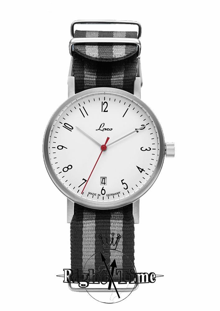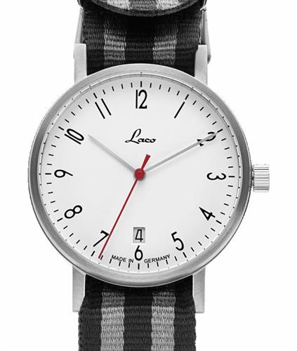 Laco Classics Dresden 40 watch model 862074. Stainless steel case. White dial with Nato style strap. Powered by automatic Miyota 9015 based movement