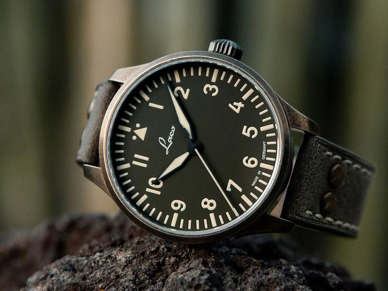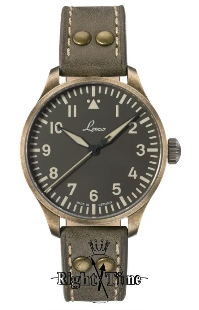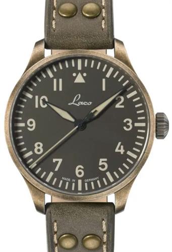 Laco Basic Augsburg Oliv model 862135. Limited edition of 250 pieces. Laco 21 (base Miyota 821A) automatic movement. Type A olive colored dial with luminous markers and Arabic numerals. Stainless steel case with an aged bronze PVD coating. Olive colored calf leather strap. Sapphire crystal.