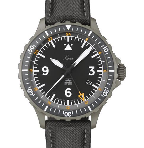 Laco Hamburg GMT DIN 8330 Watch model 862165. Steel dark sandblasted case with black leather band. Black dial. Powered by automatic movement. Water resistant to 200 meters