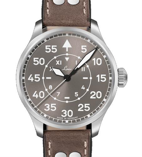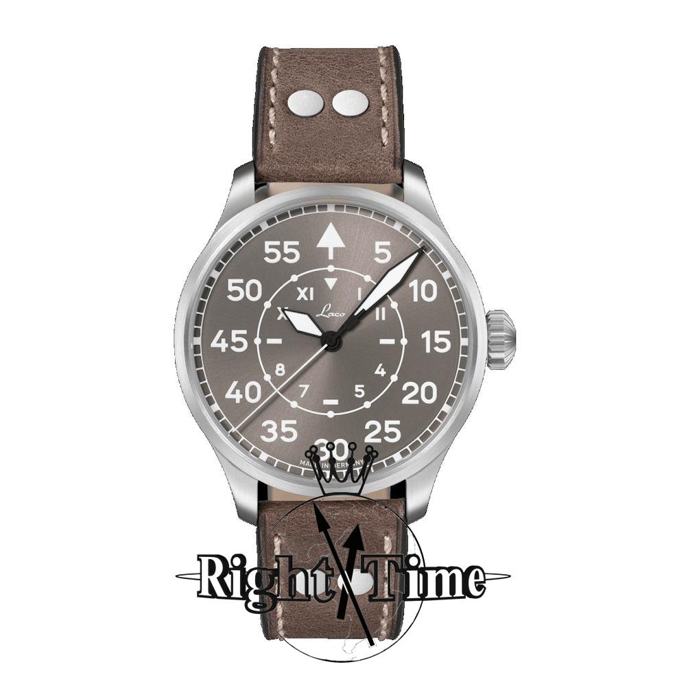 Laco Pilot Watch Basic Aachen 42 Taupe California model 862171. Limited to 200 pieces. Laco 2S (base Miyota 82S0) automatic movement. Type B grey dial with luminous markers, Roman and Arabic numerals. Stainless steel case. Brown leather strap. Sapphire crystal.