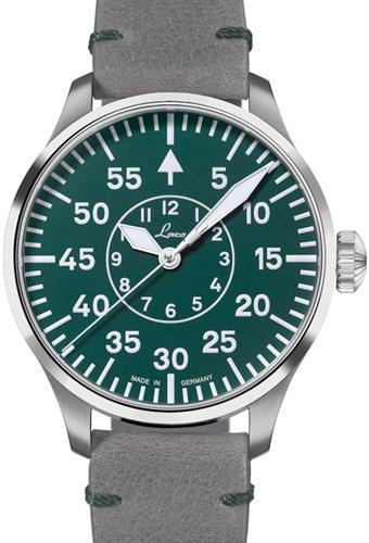 Laco Basic Aachen Grun model 862179. Laco 2S (base Miyota 82S0) automatic movement. Type B green dial with luminous markers and Arabic numerals. Stainless steel case with grey leather strap. Sapphire crystal. Limited Edition of 250 pieces.